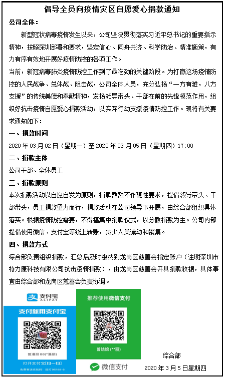 在公司層領(lǐng)導(dǎo)的帶領(lǐng)下,特力康人員紛紛解囊,小到幾十上百,大到數(shù)千,錢(qián)不分多寡,截止3月6日,結(jié)合特力康公積金捐助,共計(jì)捐款十萬(wàn)元整。這都是特力康人在力所能及范圍內(nèi)對(duì)抗擊疫情的默默支持,是對(duì)有困難群眾的守望相助。充分發(fā)揚(yáng)團(tuán)結(jié)互助精神,攜手并肩,眾志成城,凝聚起抗擊疫情的堅(jiān)定信心和強(qiáng)大力量,用另一種方式陪伴一線(xiàn)抗疫醫(yī)務(wù)人員和疫情患者一起戰(zhàn)勝病魔。