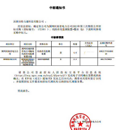 特力康中標(biāo)國(guó)網(wǎng)黑龍江送變電工程公司的2024年度第18次物資類競(jìng)爭(zhēng)性談判采購(gòu)項(xiàng)目——慶陽(yáng)驅(qū)鳥(niǎo)器物資框 特力康中標(biāo)國(guó)網(wǎng)甘肅省電力公司省管產(chǎn)業(yè)單位2024年第五次物資競(jìng)爭(zhēng)性談判授權(quán)采購(gòu)項(xiàng)目 中標(biāo)喜訊:深圳市特力康科技有限公司成功入圍許繼集團(tuán)綜合能源公司輸電線路視頻在線監(jiān)測(cè)裝置模塊集采項(xiàng)目 中標(biāo)喜訊:特力康成功中標(biāo)國(guó)網(wǎng)重慶市電力公司渝中一片區(qū)項(xiàng)目 特力康成功中標(biāo)國(guó)網(wǎng)天津市電力公司2024年第二次?物?資招標(biāo)項(xiàng)目 特力康中標(biāo)國(guó)網(wǎng)安徽省電力有限公司蕪湖供電公司2024年3月非物質(zhì)采購(gòu)項(xiàng)目 破解巡檢難題:貴州電力用特力康 AI 微拍裝置,精準(zhǔn)捕捉線路隱性隱患 精準(zhǔn)捕捉 “微氣象”:浙江電力用特力康預(yù)警系統(tǒng)筑牢電網(wǎng)氣候防線 守護(hù) “電力咽喉”:湖南電力投用百套特力康三跨 4G 監(jiān)控球,筑牢安全防線 貴州電力裝特力康電網(wǎng)架空線路覆冰監(jiān)測(cè)系統(tǒng),精準(zhǔn)防冰保電網(wǎng)過(guò)冬? 百套落地山西電網(wǎng)!特力康輕量化輸電架空線路監(jiān)拍裝置,筑牢輸電安全網(wǎng) 破解采空區(qū)隱患:山西電力裝特力康通用型監(jiān)測(cè)裝置,守鐵塔穩(wěn)運(yùn)行 寧夏配電線路安裝了我司防外破電子化智能警示牌