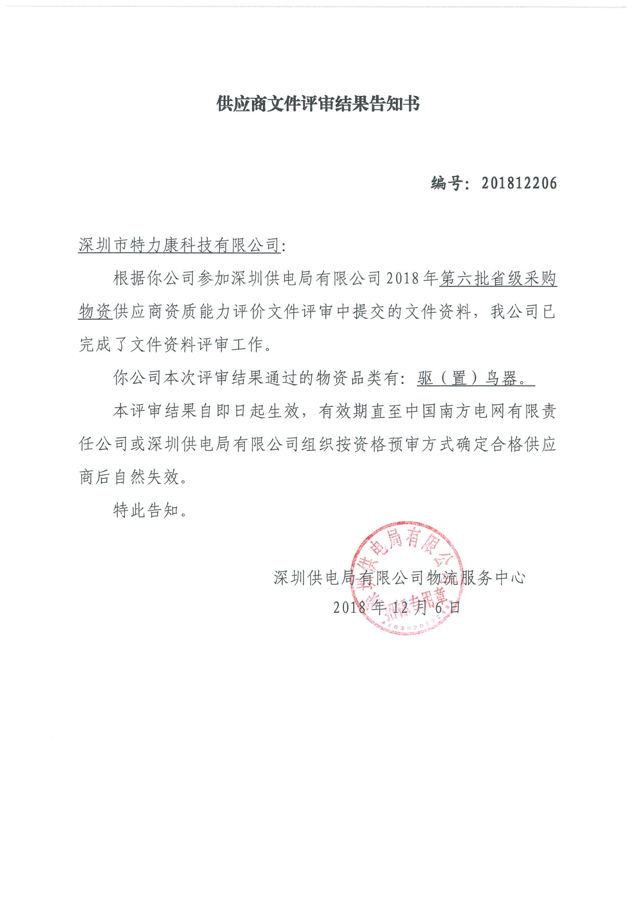 南方電網(wǎng)深圳供電有限公司2018年第六批驅(置)鳥器框架項目評審工作已結束,經(jīng)評審委員會評審,經(jīng)南網(wǎng)深圳電力公司招投標領導小組批準,我司被確定為此次驅(置)鳥器框架中標單位現(xiàn)將公告公示。