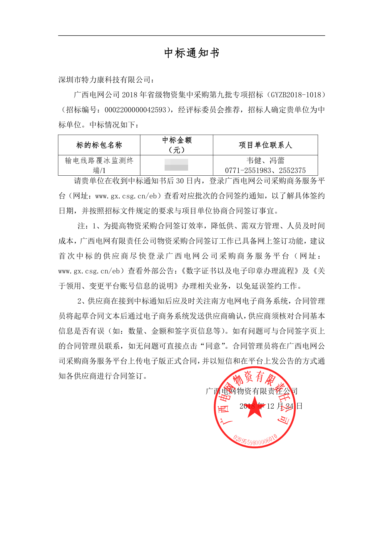 南方電網(wǎng)廣西供電局2018省級物資集中采購第九批專項招標項目評審工作已結(jié)束,經(jīng)評審委員會評審,經(jīng)南網(wǎng)廣西供電公司電力公司招投標領(lǐng)導(dǎo)小組批準,將評審結(jié)果公示。我司被確定為此項目簽約單位現(xiàn)將公告公示。
