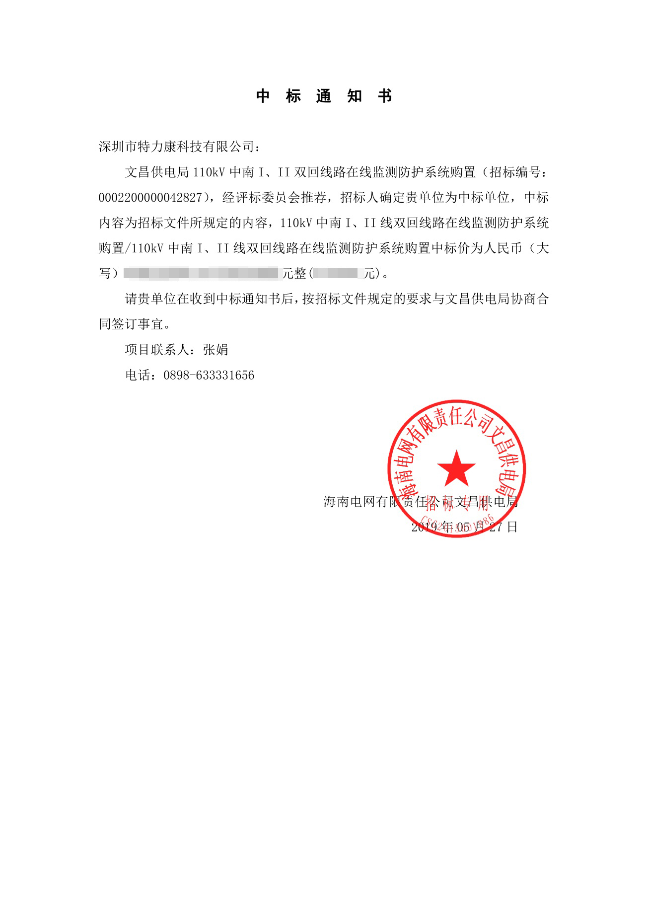 經(jīng)評標委員會推薦,文昌招標單位,確定我司(深圳市特力康科技有限公司)為文昌供電局雙回線在線監(jiān)測防護系統(tǒng)項目中標單位,現(xiàn)將中標公告公示。
