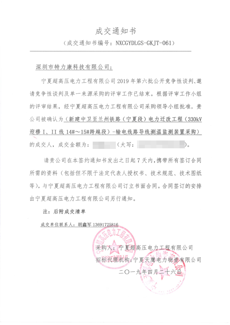 寧夏超高壓局2019年第六批公開競爭性談判電力遷改項目評審工作已結(jié)束,經(jīng)評審委員會評審,經(jīng)寧夏超高壓局招投標領(lǐng)導小組批準,我司被確定為此項目簽約單位現(xiàn)將公告公示。