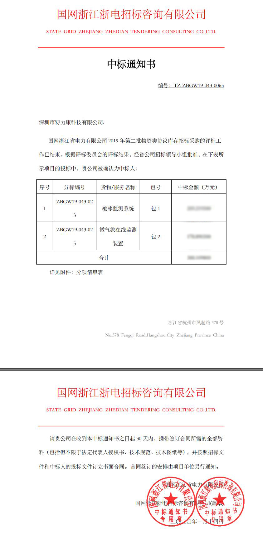 國(guó)網(wǎng)浙江省電力有限公司2019年第二批物資類協(xié)議庫(kù)存招標(biāo)采購(gòu)的評(píng)標(biāo)工作已結(jié)束。根據(jù)評(píng)標(biāo)委員會(huì)的評(píng)標(biāo)結(jié)果,經(jīng)省公司招標(biāo)領(lǐng)導(dǎo)小組批準(zhǔn),我司(深圳市特力康科技有限公司)中標(biāo)ZBGW19-043-023覆冰監(jiān)測(cè)系統(tǒng)包1及ZBGW19-043-025微氣象在線監(jiān)測(cè)包2兩個(gè)標(biāo)包,現(xiàn)附中標(biāo)通知書如下: