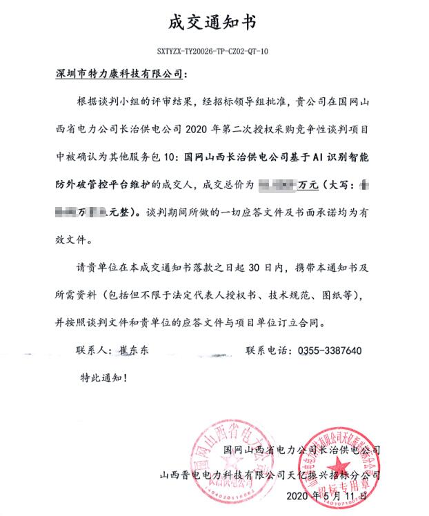 根據(jù)談判小組的評審結(jié)果,經(jīng)招標(biāo)領(lǐng)導(dǎo)組批準(zhǔn),我司(深圳市特力康科技有限公司)在國網(wǎng)山西省電力公司長治供電公司2020年第二次授權(quán)采購競爭性談判項(xiàng)目中被確認(rèn)為其他服務(wù)包10:國網(wǎng)山西長治供電公司基于AI識(shí)別智能防外破管控平臺(tái)維護(hù)的成交人?,F(xiàn)附中標(biāo)通知書如下:
