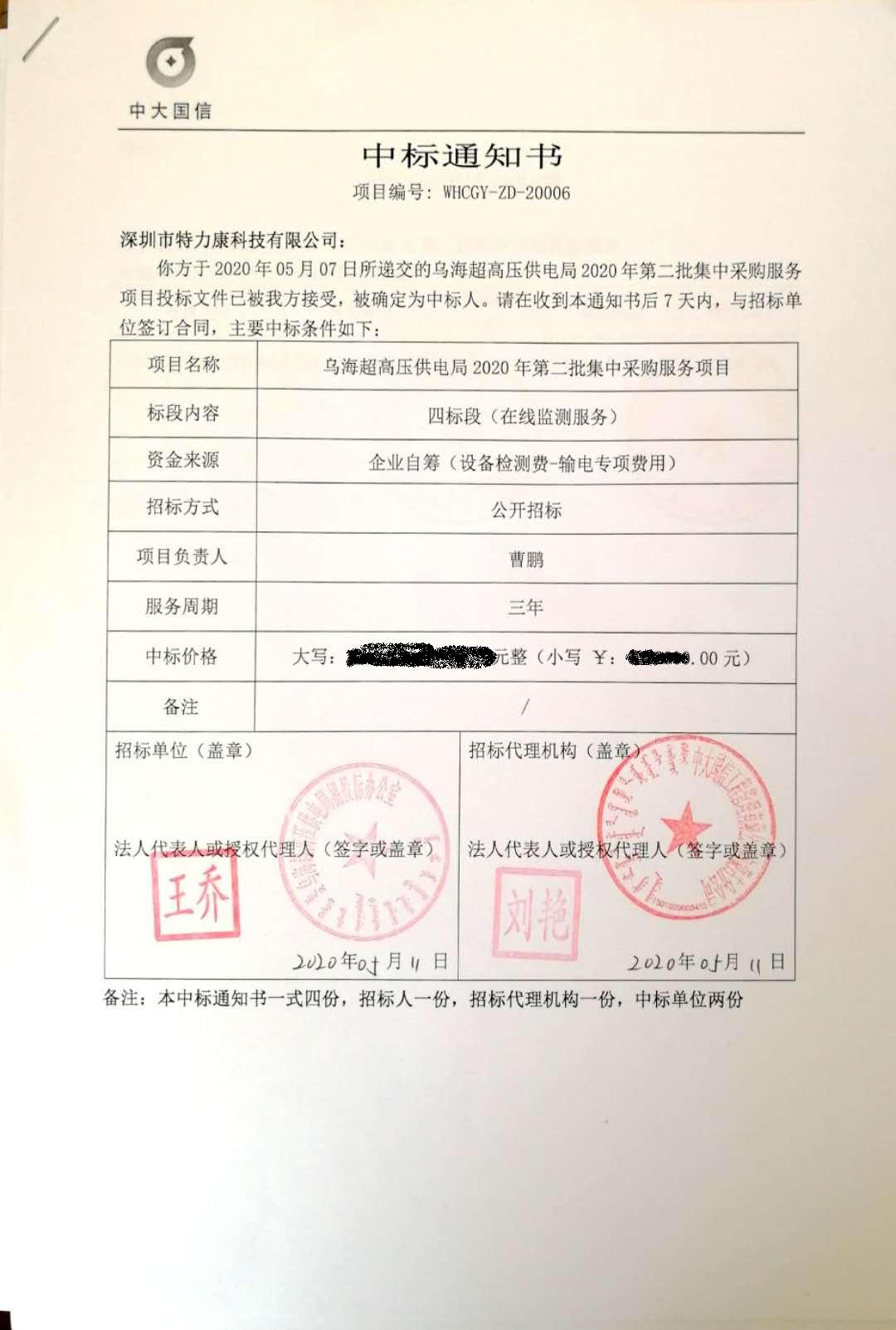 經(jīng)招標領(lǐng)導組批準,我司于2020年05月07日所遞交的烏海超高壓供電局2020年第二批集中采購服務項目(四標段:在線監(jiān)測服務)投標文件已被局方接受,被確定為中標人。特發(fā)中標通知書,如下: