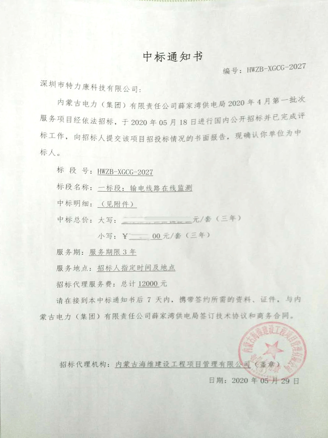 內(nèi)蒙古電力(集團(tuán))有限責(zé)任公司薛家灣供電局2020年4月第一批次服務(wù)項(xiàng)目(一標(biāo)段:輸電線路在線監(jiān)測(cè))經(jīng)依法招標(biāo),于2020年05月18日進(jìn)行國(guó)內(nèi)公開(kāi)招標(biāo)并已完成評(píng)標(biāo)工作,向招標(biāo)人提交該項(xiàng)目招投標(biāo)情況的書(shū)面報(bào)告,現(xiàn)確認(rèn)我司(深圳市特力康科技有限公司)為中標(biāo)人。特發(fā)中標(biāo)通知書(shū),如下: