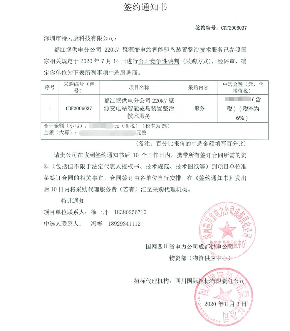 2020年7月14日我司(深圳市特力康科技有限公司)參加的都江堰供電分公司220kV聚源變電站智能驅(qū)鳥裝置整治技術(shù)服務(wù),已參照國家相關(guān)規(guī)定進(jìn)行公開競爭性談判(采購方式),后經(jīng)專家評審,確定我司為都江堰供電分公司220kV聚源變電站智能驅(qū)鳥裝置整治技術(shù)服務(wù)中選服務(wù)商。特發(fā)簽約通知書如下: