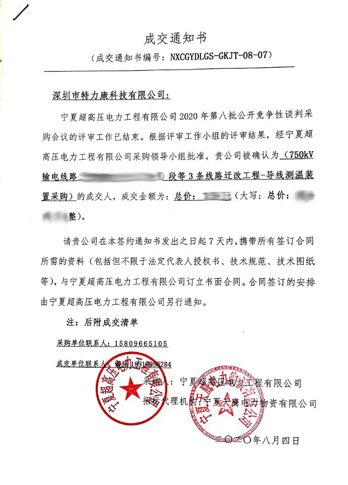 寧夏超高壓電力工程有限公司2020年第八批公開(kāi)競(jìng)爭(zhēng)性談判采購(gòu)會(huì)議的評(píng)審工作已結(jié)束。根據(jù)評(píng)審工作小組的評(píng)審結(jié)果,經(jīng)寧夏超高壓電力工程有限公司采購(gòu)領(lǐng)導(dǎo)小組批準(zhǔn),我司(深圳市特力康科技有限公司)被確認(rèn)為_(kāi) (750kV輸電線路中3條線路遷改工程-導(dǎo)線測(cè)溫裝置采購(gòu))的成交人,現(xiàn)發(fā)布成交通知書(shū)如下: