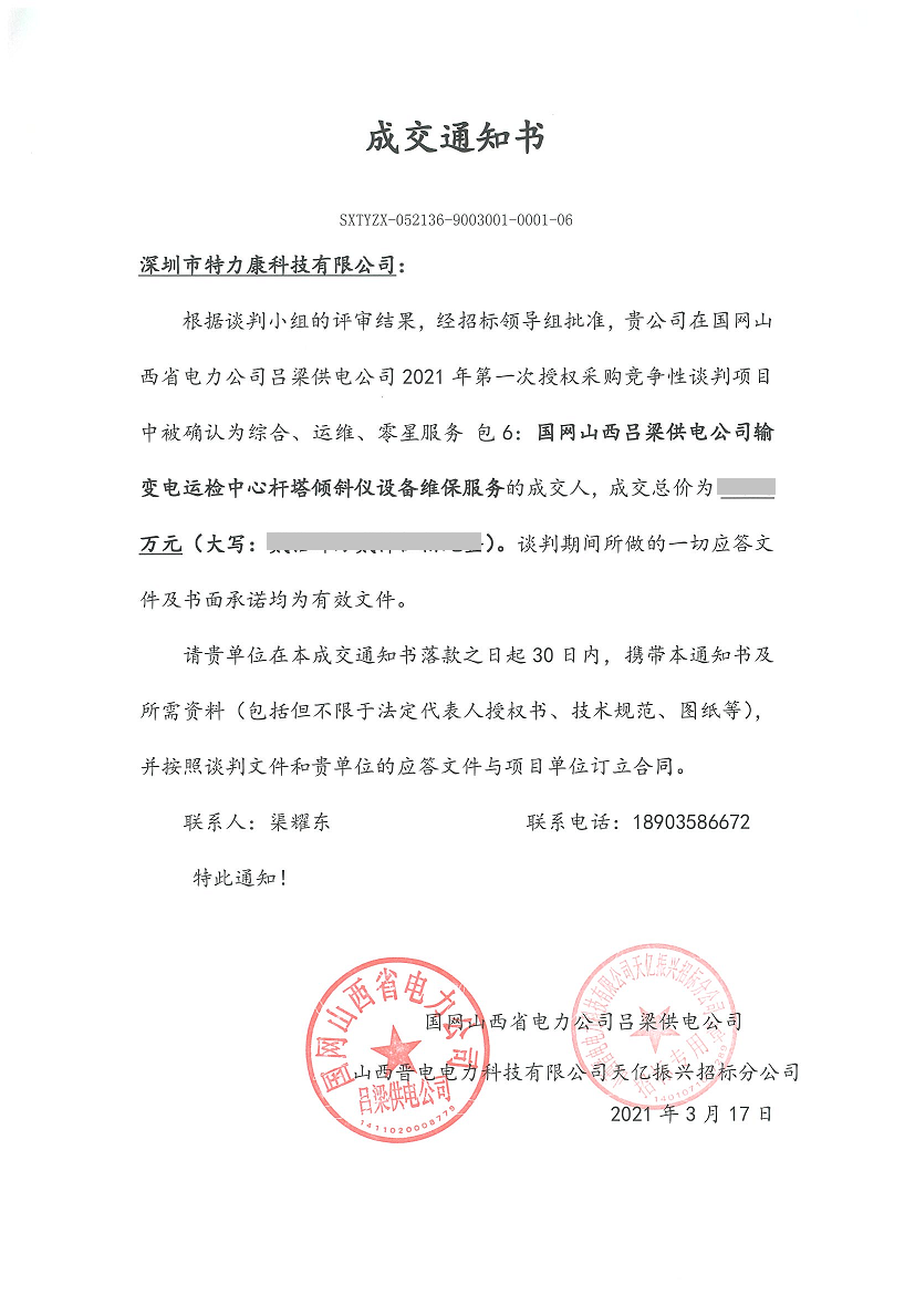 根據(jù)談判小組的評(píng)審結(jié)果,經(jīng)招標(biāo)領(lǐng)導(dǎo)組批準(zhǔn),貴公司在國(guó)網(wǎng)山西省電力公司呂梁供電公司2021年第一次授權(quán)采購(gòu)競(jìng)爭(zhēng)性談判項(xiàng)目中被確認(rèn)為綜合、運(yùn)維、零星服務(wù)包6:國(guó)網(wǎng)山西呂梁供電公司輸變電運(yùn)檢中心桿塔傾斜儀設(shè)備維保服務(wù)的成交人,成交通知如下:
